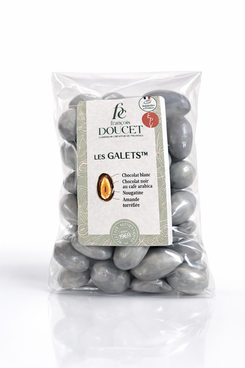 - Les Galets : AMANDES 32%, sucre, chocolat blanc 16%, ( sucre, beurre de cacao, poudre de LAIT écrémé, matière grasse LAITIERE, émulsifiant : lécithine [SOJA], arôme naturel de vanille ), pâte de cacao, beurre de cacao, café arabica 1%, agents d’enrobage : gomme d’acacia et gomme laque, émulsifiant : lécithine [SOJA], arôme naturel de vanille, plantes aromatiques. Peut contenir d’autres fruits à coques, gluten, œufs.