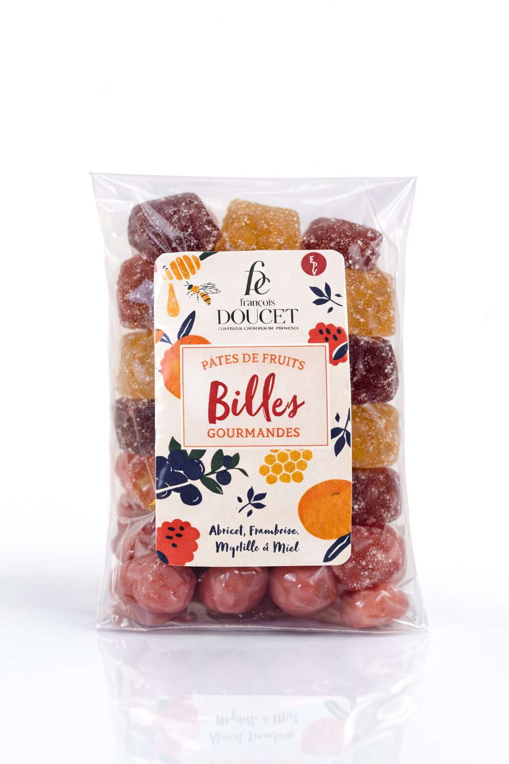 - Pâtes de Fruits Billes Gourmandes : sucre, pulpes de fruits 38% (abricot 19%, framboise 6,5%, poire 6,5%, myrtille 6%), sirop de glucose, miel de lavande de Provence 7,5%, eau, gélifiant : pectine, acidifiant : acide citrique, arômes naturels de fruits (framboise, myrtille, abricot), arôme naturel de vanille Bourbon. Peut contenir des fruits à coques, gluten.