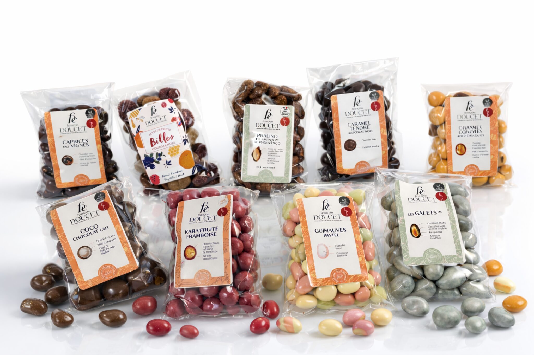 - Oranges Confites aux 2 chocolats : chocolat noir 35% (pâte de cacao, sucre, beurre de cacao, émulsifiant : lécithine (SOJA), arôme naturel de vanille), chocolat blanc 31% (sucre, beurre de cacao, poudre de LAIT écrémé, matière grasse LAITIERE, émulsifiant : lécithine [SO|A], arôme naturel de vanille), écorces d’oranges confites 21% (orange, glucose), pate d’amande 10% (AMANDES, sucre, stabilisants: sorbitol et gomme d’acacia, huile essentielle d’amande amère), agents d’enrobage: gomme d’acacia et gomme laque, huile essentielle d’orange, eau, sucre, ingrédients colorants: jus de betterave, paprika. Peut contenir d’autres fruits à coques, gluten, œufs.